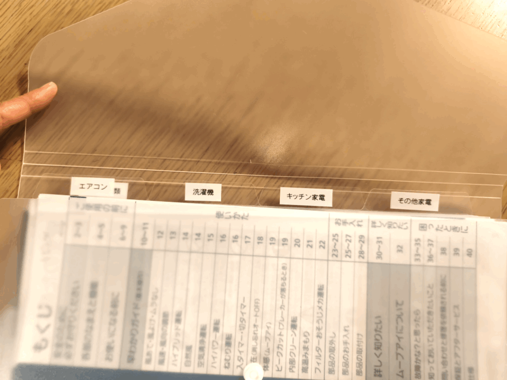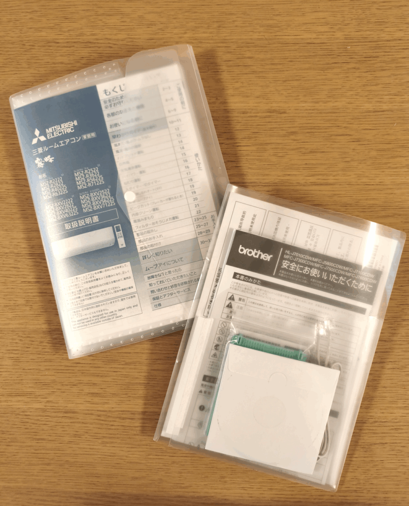 取扱説明書は紙で取っておきたいタイプです。冷蔵庫やエアコンなどの大型の家電や保証期間内の保証書はまとめて、クリアブックに入れていました。でも、ポケットが柔らかく、取扱説明書もかさばるのでパンパンに…。収納を見直すことにしました。