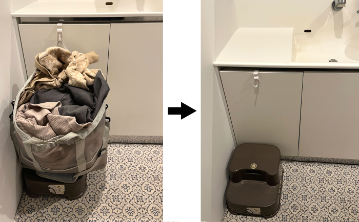 突っ張り棒って、本当に万能ですよね。今回は洗濯機上に洗濯物かご置場をつくって、ランドリースペースを見直しました。